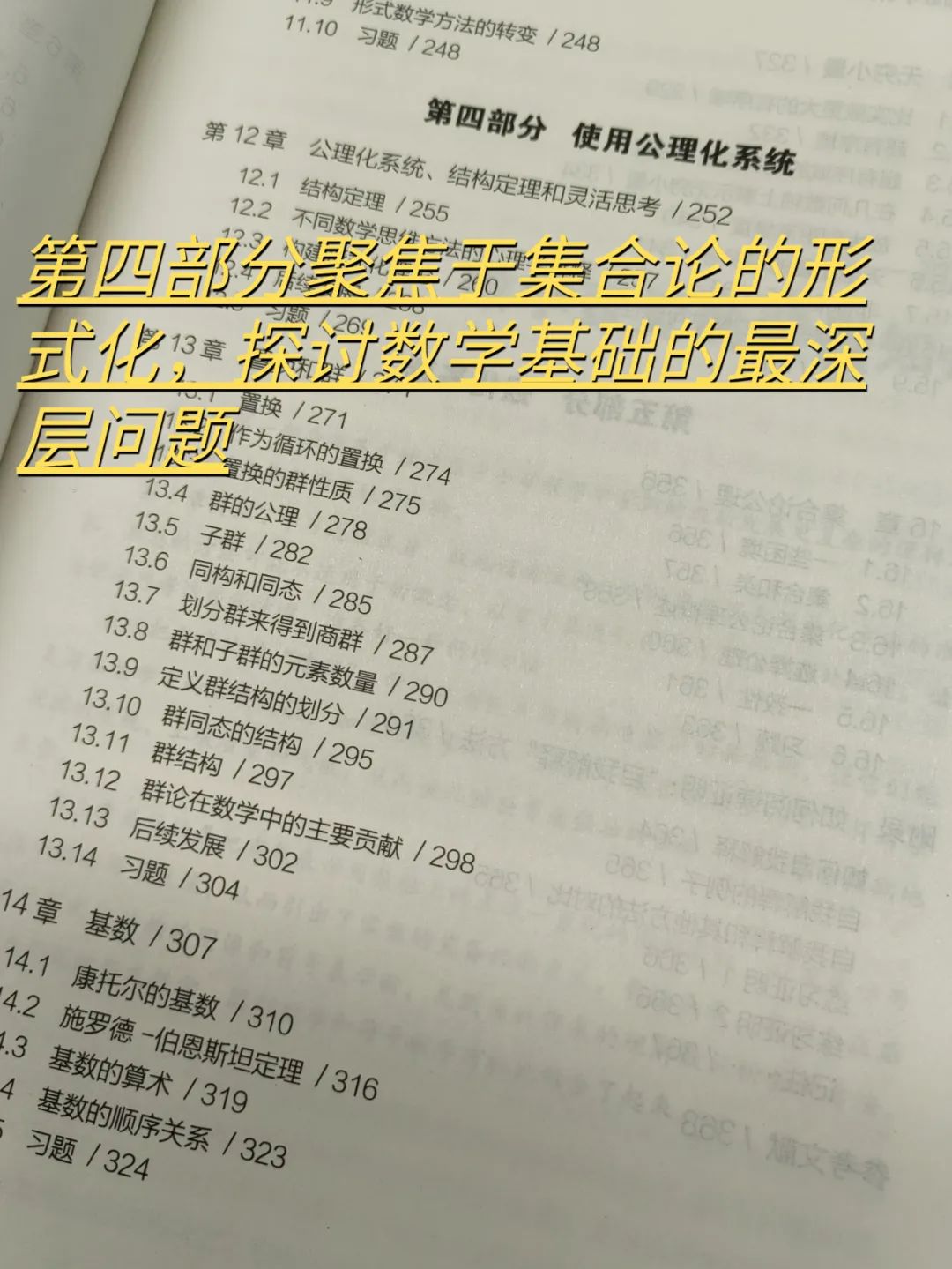 第四部分涉及群论、基数和无穷小量,这些是公理化系统的使用,也是构建方法的应用扩展;