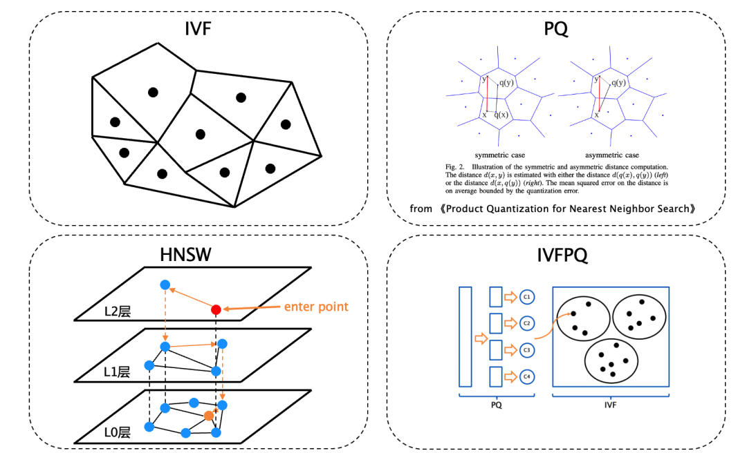 对于向量检索,常见的 ANN 索引类型有 IVF、HNSW、PQ、IVFPQ