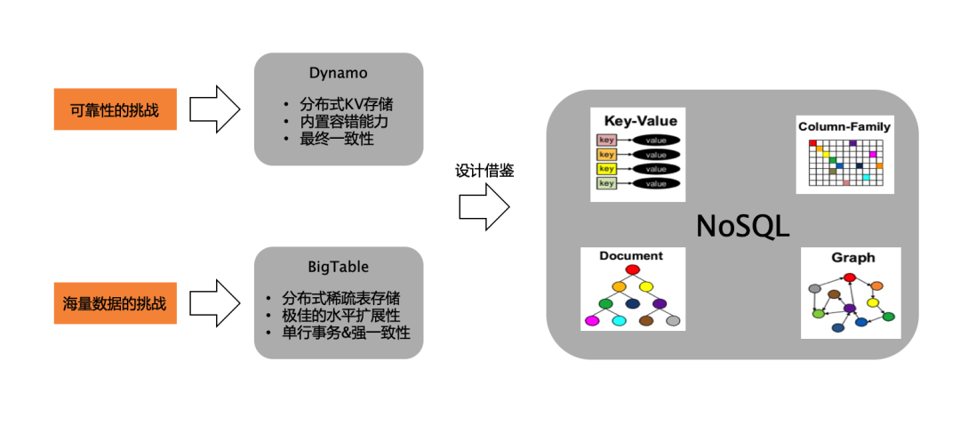 Dynamo 和 BigTable 都是为了解决各自业务场景所遇到的数据挑战而提出的,两者都有着丰富的设计思路和技术实现。这些设计和实现为后续的很多 NoSQL 产品所借鉴,并经常搭配使用,从而解决业务场景的各种挑战。例如 HBase 借鉴了 BigTable 的数据模型、Cassandra 借鉴了 BigTable 的数据模型和 Dynamo 的分布式设计。