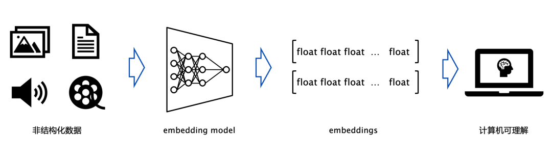 现代 AI/ML 技术的发展提供了一种从非结构数据中提取语义信息的方式 —— embedding。区别于前面提到的标量类型,embedding 是一种向量类型 —— 由多个数值组成的数组,因此 embedding 又被称为向量或者矢量。embedding 是非结构化数据的数值表示,能够将非结构化数据映射到其“含义”空间,使得计算机能够理解非结构化数据的语义信息。