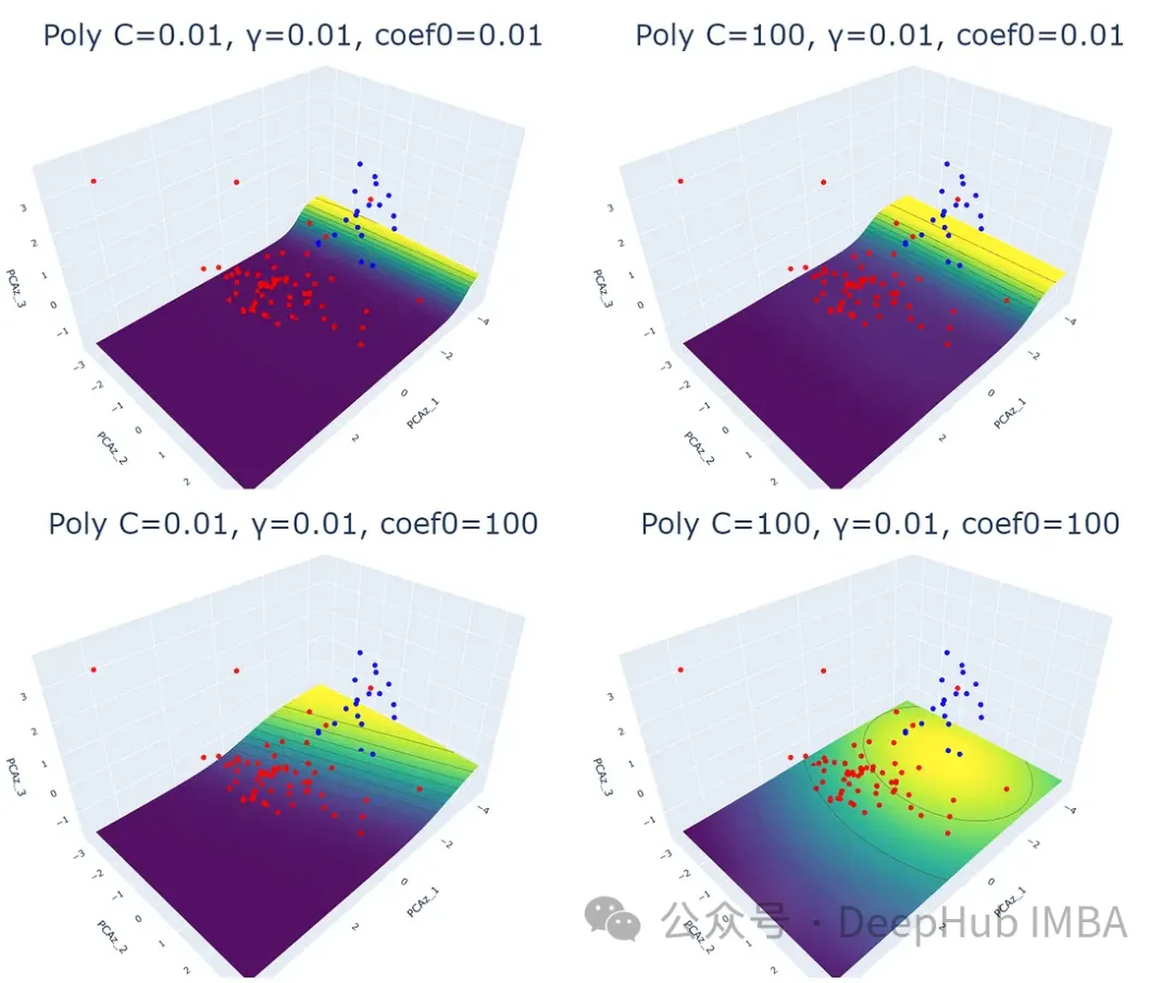 首先对宝可梦数据集进行了探索性数据分析 (EDA),包括数据预处理、标准化和降维。然后,针对每个核函数,通过调整正则化参数 (C)、核系数 (γ) 和独立项 (coef0),绘制了 3D 散点图和预测概率等高线图。