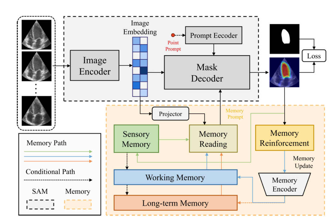基于此,由深圳大学计算机与软件学院和香港理工大学智能健康研究中心联合组成的团队,在计算机视觉顶级会议 CVPR 2024 上发布了题为「MemSAM: Taming Segment Anything Model for Echocardiography Video Segmentation」的论文。在论文中,研究人员提出了一种新颖的超声心动图视频分割模型 MemSAM,将 SAM 应用于医学视频。