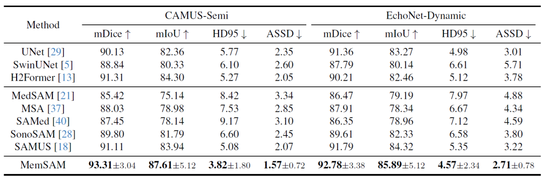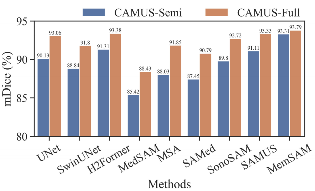 为了进一步评估 MemSAM,研究人员还在相同设置下对 CAMUS-Semi 和 CAMUS-Full 数据集进行了比较。结果如下图所示: