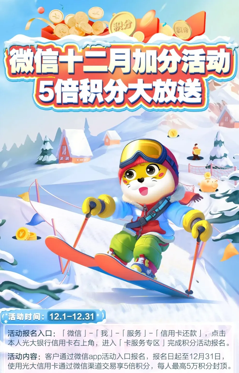 1. **微信支付5倍积分:** 整个12月,使用光大信用卡绑定微信支付可享5倍积分,上限5万分。