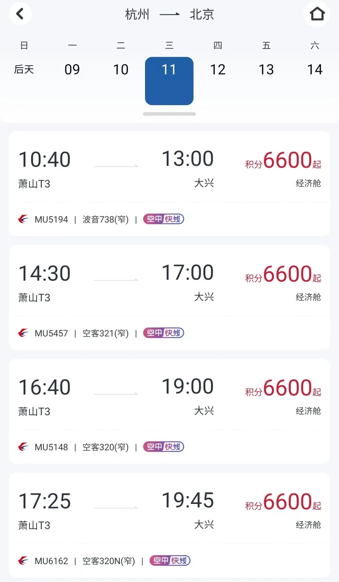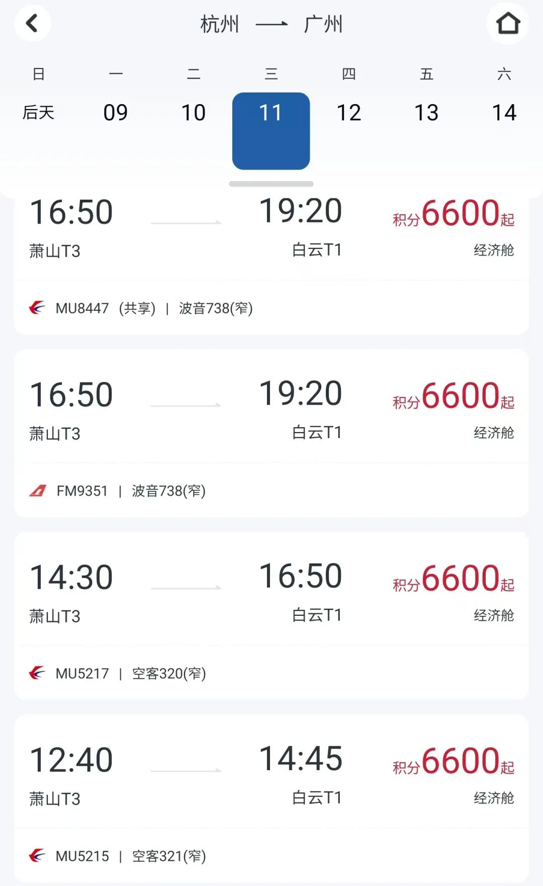 例如杭州飞广州,原先12000里程,现在6600里程: