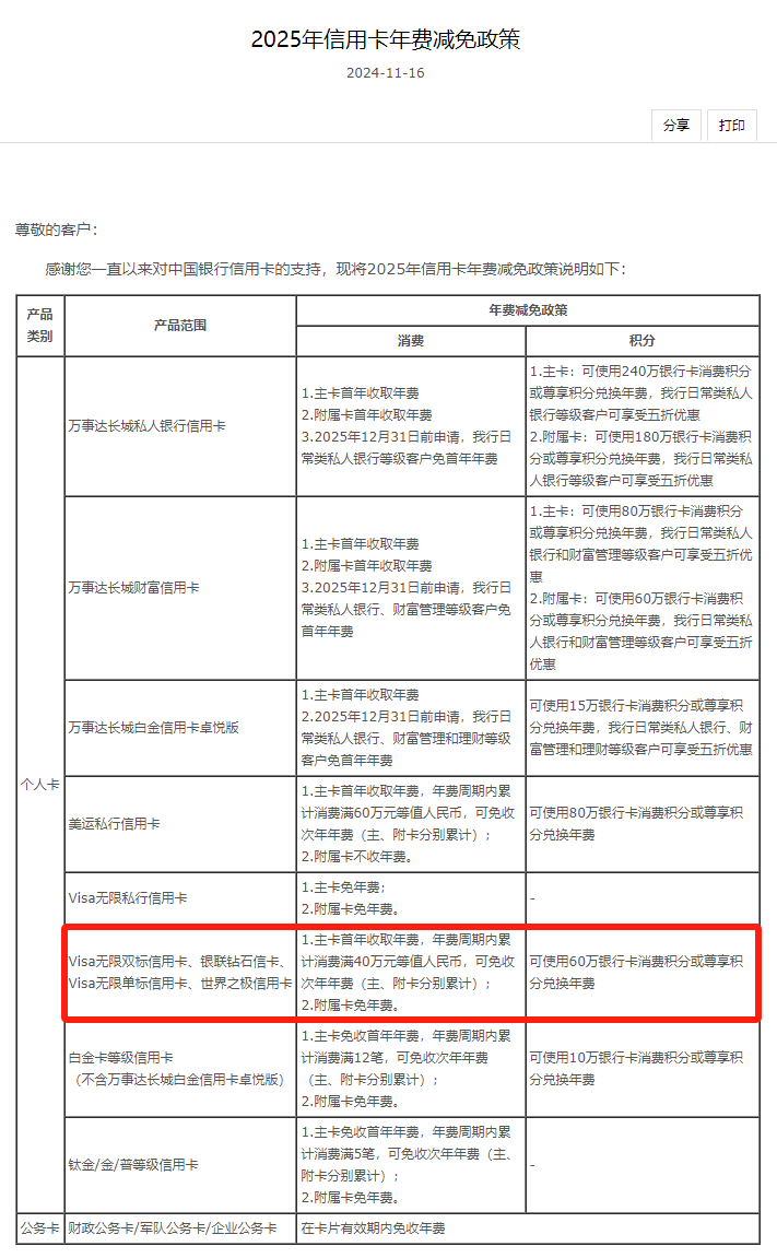 11月16日,中行发布2025年信用卡减免政策,几无权益的钻石卡/世界之极仍然要60万积分抵扣年费,我做了挂失处理。