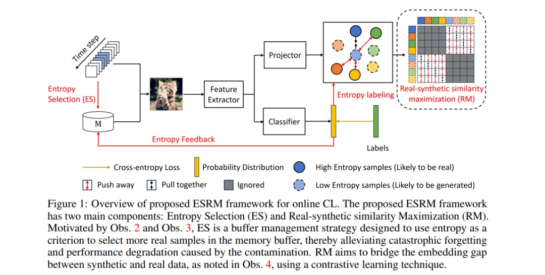 为缓解合成图像对在线持续学习模型性能的负面影响,我们提出了一种新的方法:基于熵选择的真实-合成相似性最大化(Entropy Selection with Real-Synthetic Similarity Maximization, ESRM)。该方法的核心目标是在训练过程中减轻由合成图像污染导致的性能下降问题。实验结果表明,特别是在污染程度较高的情况下,我们的方法显著缓解了性能下降。