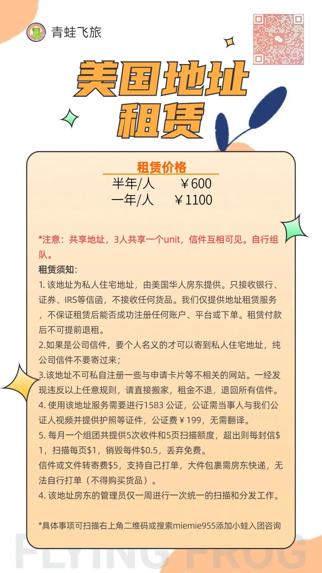 美国地址:私人住宅地址,非常稳定(不会像atmb上一些地址那样租完之后变成商业地址,还要搬家)。3人成团,属于3人共享地址(信件相互可见,但信用卡收卡信件一般都是直接转寄,没有人会拆开扫描这类信件)。半年租用费用每人¥600,一年¥1100,建议长期租用下卡更方便。可提供1583公证服务,费用¥199,无需翻译。地址价格包括每组每月提供5次免费收件、5页免费扫描服务。更多租赁事项可以回复“团办”加小蛙咨询。