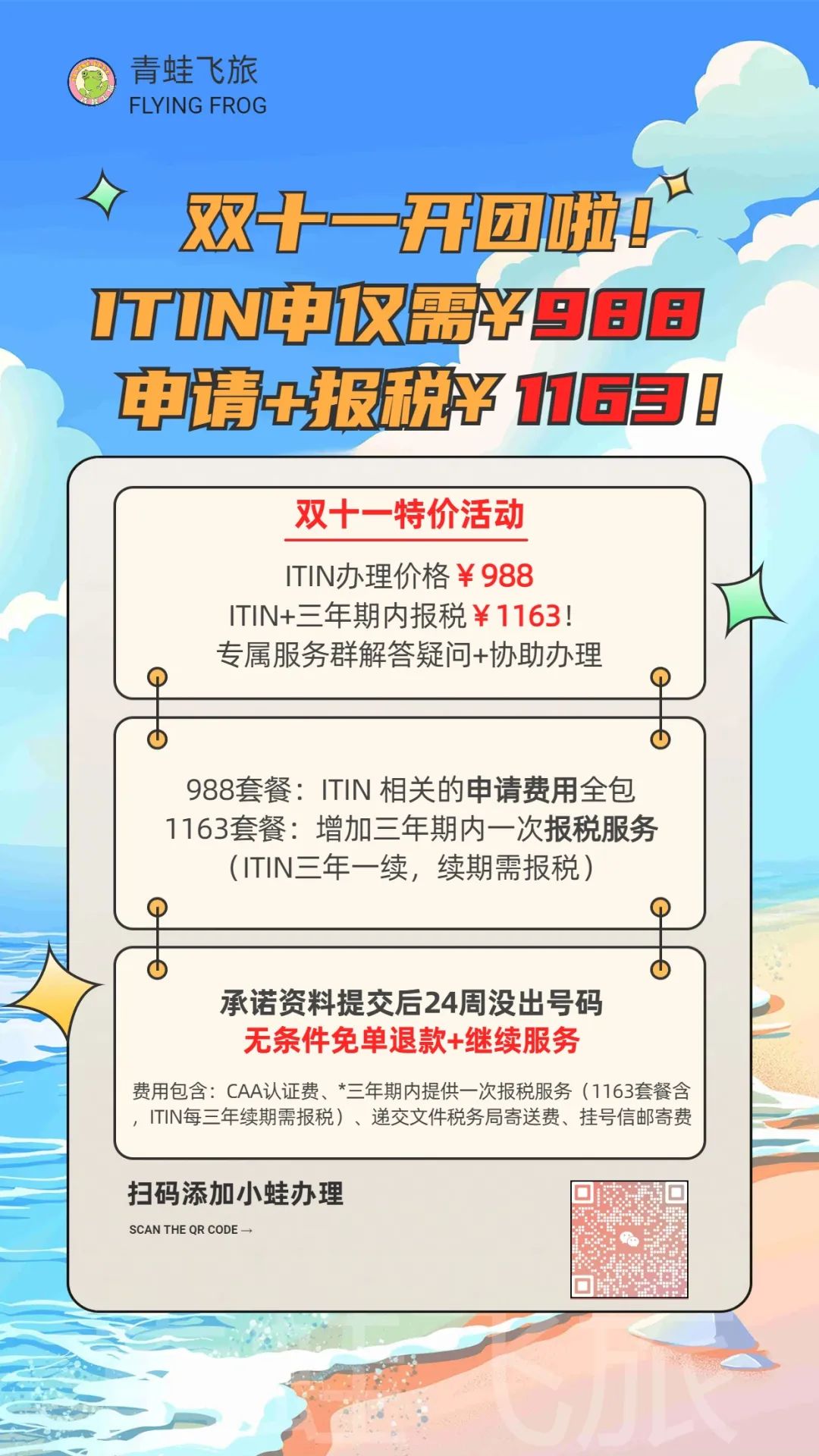 ITIN:现有套餐两个,ITIN办理价¥988,ITIN+三年期内一次报税服务¥1163,淘宝直拍。详情请回复"ITIN"或"团办"加小蛙咨询。
