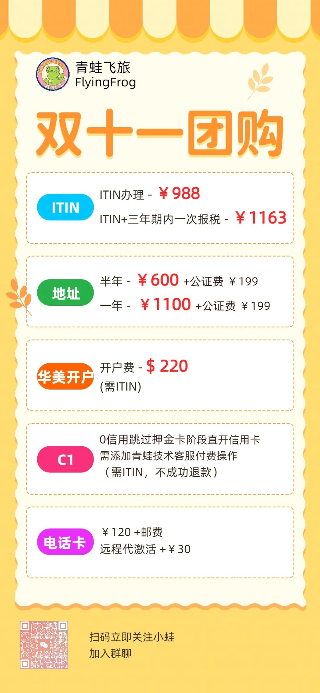 双十一小蛙的活动又来了,这次从ITIN到美国地址租赁、到储蓄账户(华美银行)开户,以及0信用直开C1信用卡、Paygo电话卡团购的服务都有哦!价格如下👇,后台回复“团办”或直接加小蛙微信号"miemie955"加入吧!