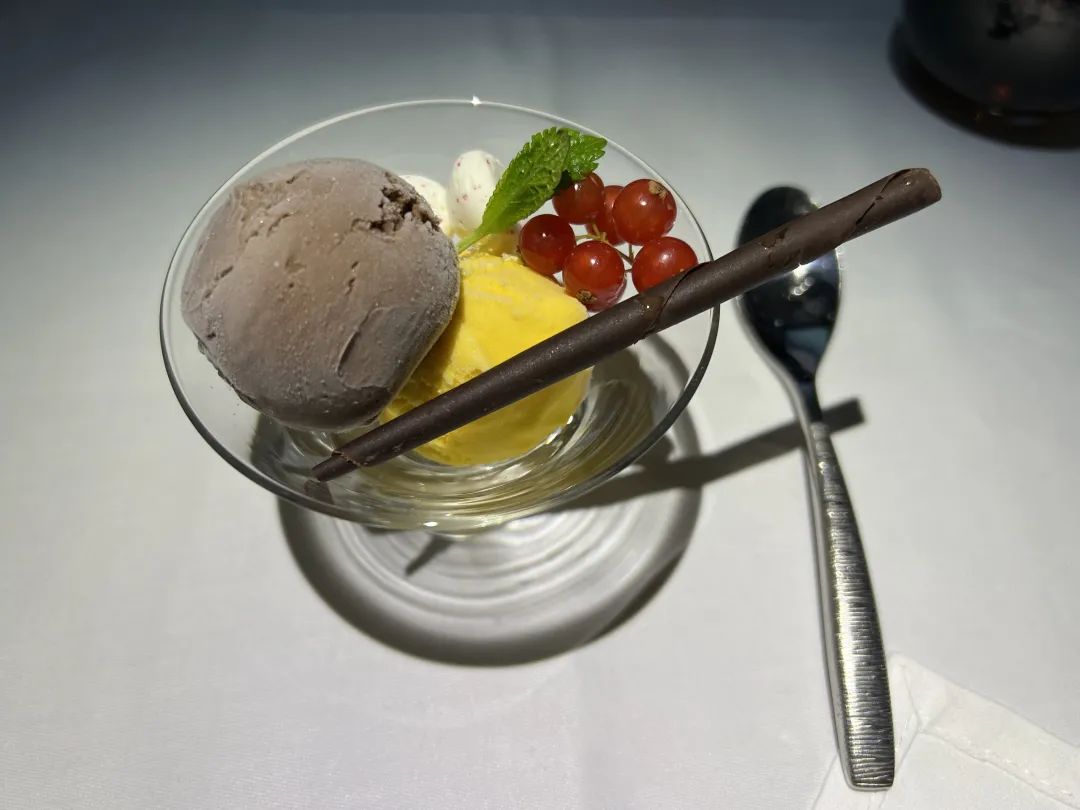机上餐饮方面,作者对中东菜系表示喜爱,对卡航提供的餐食也给予好评,包括前菜、主菜(牛里脊、鸡胸肉、烤鳕鱼)以及冰淇淋。