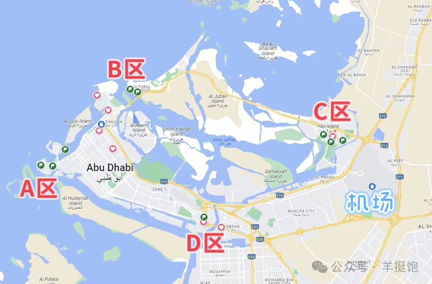 阿布扎比的景点基本分三个区+一个大清真寺,如图。