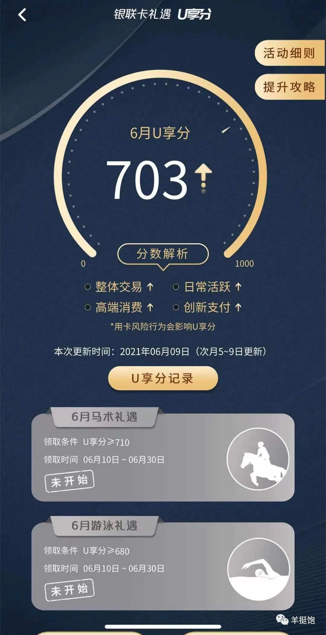 云闪付APP预定游泳,可预定第二到第四天,可使用2次/月,需要支付1块钱,带人支付62,带人算进每年24次次数,但每日数量有限需要抢兑,手慢无,不算很好抢,需要准点进去一气呵成,基本上开抢30秒之后就没了(所以你看,不仅白金卡滥发,钻石卡都滥发了)。所以后来云闪付也意识到了这个问题,推出了一个等级分数达标赠送额外3次的机制,不需要抢兑随时都能预定,而且带人也是1块钱,算是在千军万马中留了一条捷径。只不过这个等级机制是个谜,基本上云闪付用的越多分数越高,有的一开始就达标了,有的人可能要过两年才能过上达标的日子。