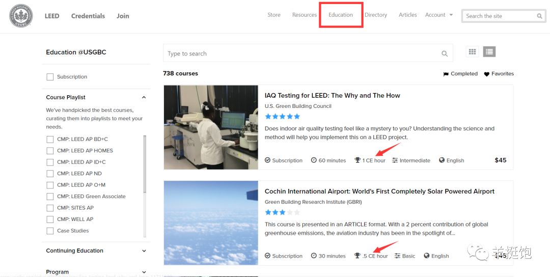 网上课程需要进入USGBC教育板块:https://new.usgbc.org/education,里面可以看到各种课程的详细信息,包括学时、价格等。
