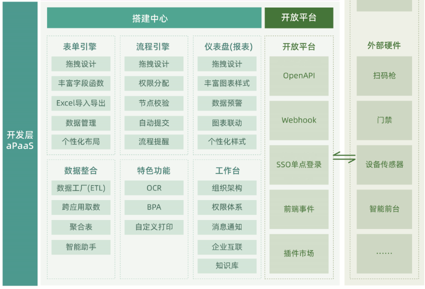 包括工作台、表单引擎、流程引擎、仪表盘和数据整合等功能模块,在应用层实现通用场景模板以及垂直细分的行业解决方案,并与外部软硬件关联。