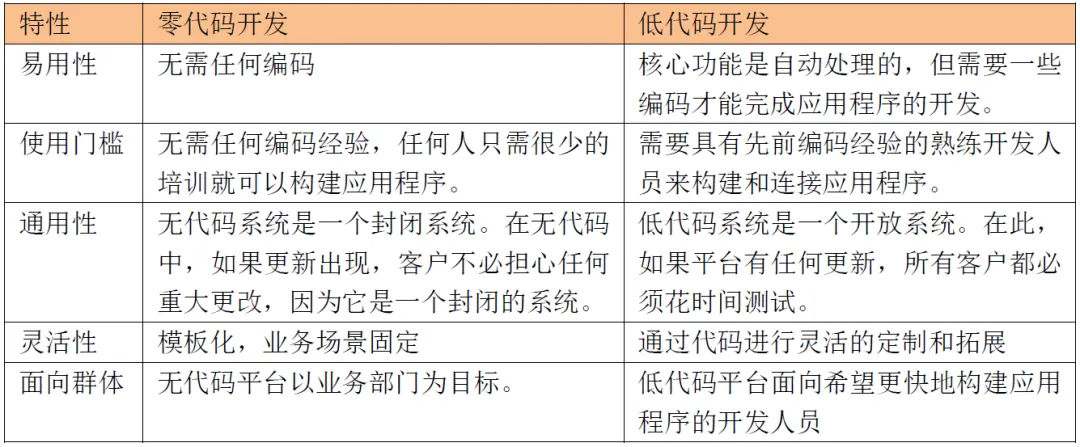 低代码平台分为低代码和零代码两种,低代码面向开发人员,需要少量代码,应用场景更广;零代码面向业务人员,完全无需代码,更加轻便快捷,但功能相对有限。