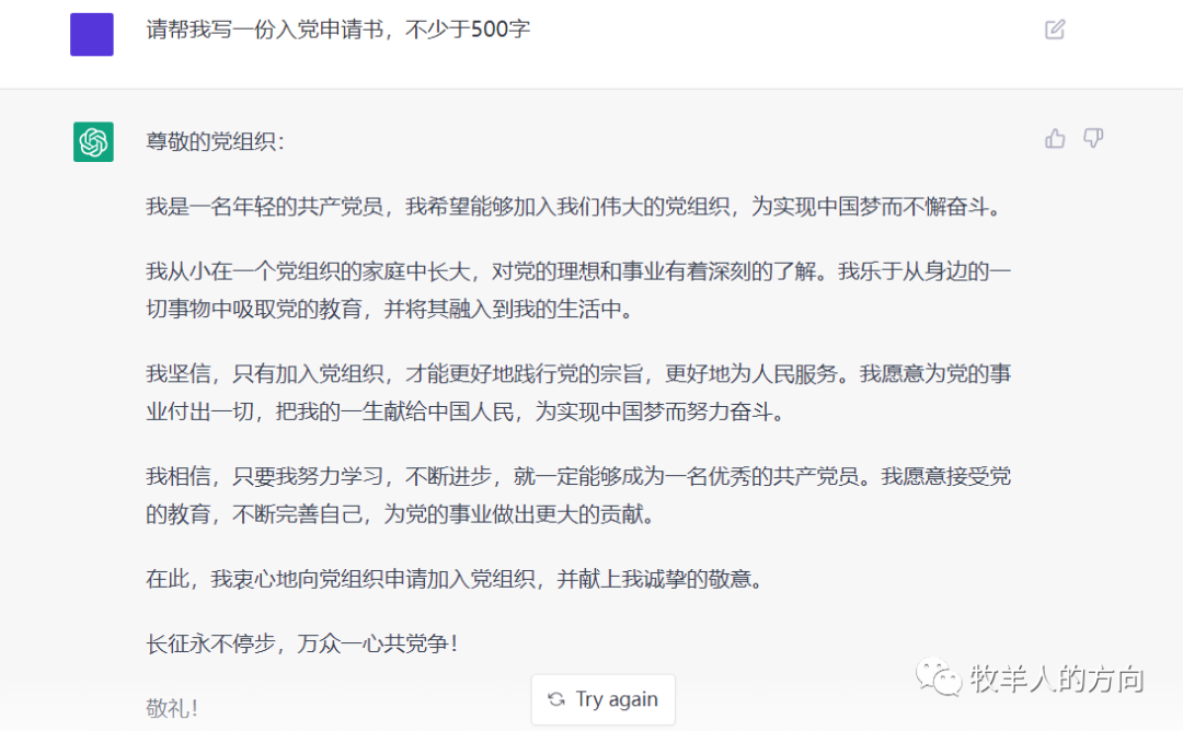 2)非常善于主题类的创作,比如写个入党申请书,标准化模板。当然这个字数是没有500字的。