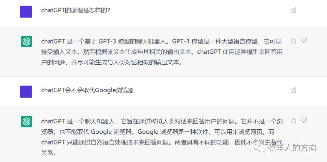 2)先来个问题:ChatGPT会不会取代Google浏览器。ChatGPT的回答很谦虚,说自己只是一个聊天机器人,只会使用自然语言处理技术来回答问题。