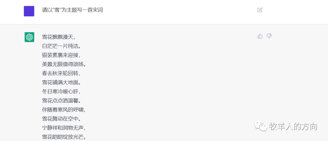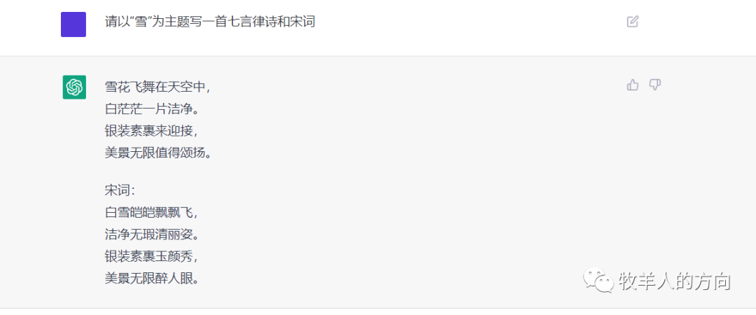 5)写一首以“雪”为主题的宋词,这个结果就有些差强人意了,大白话没有一点宋词的韵律和美感。