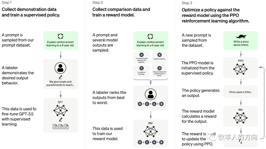 ChatGPT在原理上是基于GPT 3.5大规模语言模型(LLM)引入“人工标注数据+强化学习”(RLHF)来不断Fine-tune预训练语言模型,主要目的是让LLM模型学会理解人类的命令指令的含义。具体而言分为以下三个阶段: