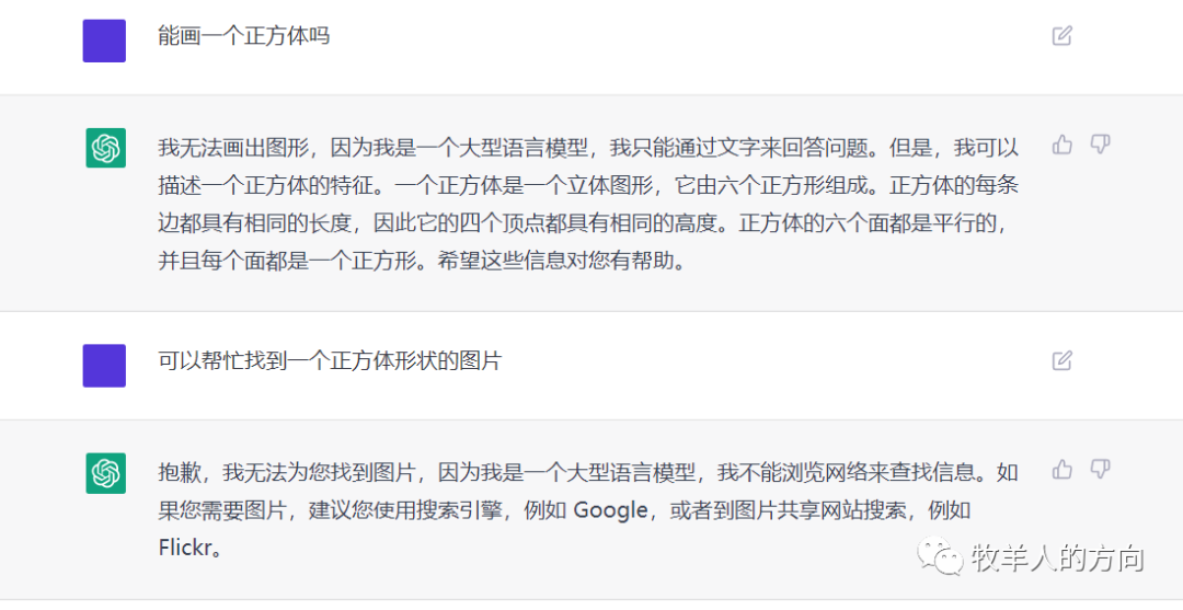 3)目前只适用于文本类的回答,图片类型的无法满足。比如画一个正方体或者找到相关的图片