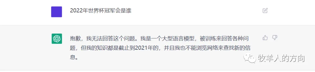 3)问一个2022年世界杯冠军是谁。从回答中可以看到ChatGPT是基于内部的数据训练的,所有的知识是到2021年的,暂时还不能实时的去获取到知识。