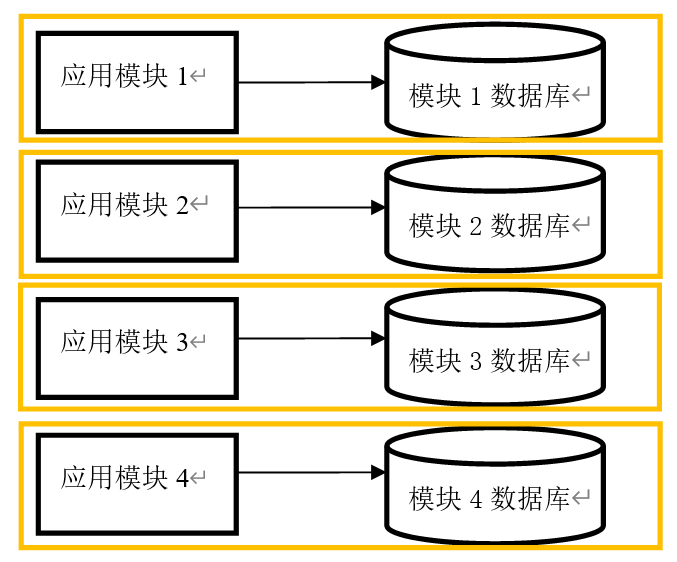 如上图,黄框代表一个一个单元或微服务的机器,每个框都是一个整体,比如应用模块1对应着模块1数据库、应用模块2对应着模块2数据库。若一笔交易通常会涉及到多个微服务调用时,那就需要在微服务框架内进行跨模块的远程调用,并由应用实现分布式事务来保证一致性,与单元化类似。同样,也做不到整个核心系统数据同一时点的一致性备份和恢复。