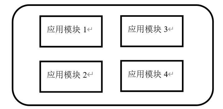 首先介绍最早期的核心系统应用整体打包模式,如下图可以看到核心系统的应用程序,虽然分了很多模块,但是最终编译打包成一个可执行程序运行。