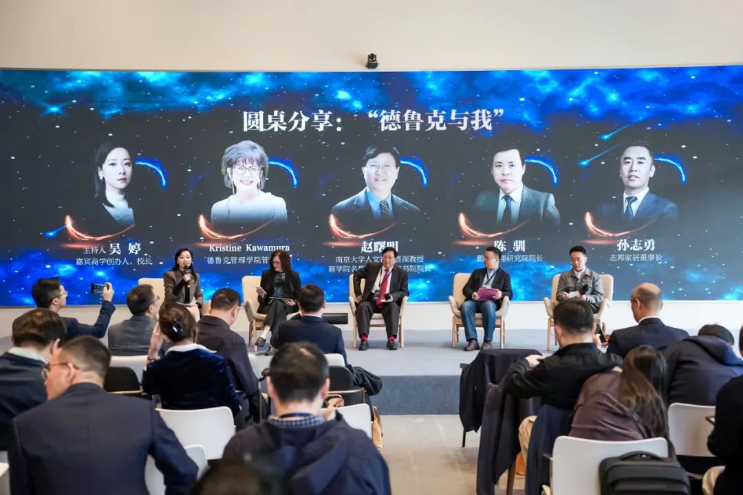 在上午的圆桌分享环节由嘉宾商学创办人、校长吴婷主持,德鲁克管理学院管理教授Kristine Kawamura,南京大学人文社科资深教授、商学院名誉院长、行知书院院长赵曙明,鹏信管理研究院院长陈驯,志邦家居董事长孙志勇,分别分享了他们与德鲁克本人结缘的故事以及德鲁克思想对自己的启发。