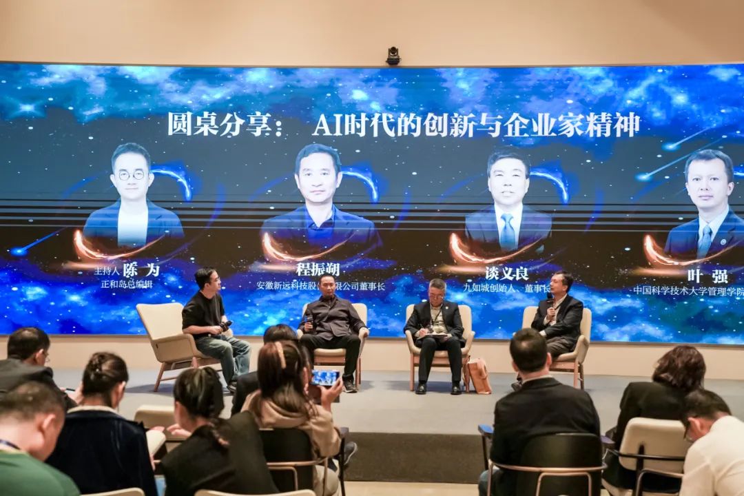 最后一个圆桌讨论由正和岛副总裁、总编辑陈为主持,安徽新远科技股份有限公司董事长程振朔、九如城创始人谈义良、中国科学技术大学管理学院执行院长叶强共同探讨了AI时代的创新与企业家精神的话题。