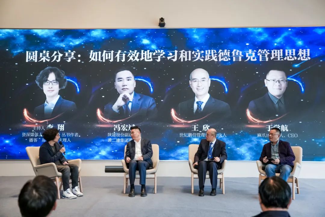 陕建股份副总经理兼⼆建集团董事⻓冯宏斌、世纪鹏信管理咨询合伙人王欣、麻爪爪餐饮创始人于学航在资深媒体人李翔主持下,就围绕“如何有效学习和实践德鲁克管理思想”展开圆桌对话,分享了将德鲁克思想融入日常管理的经验和心得体会。