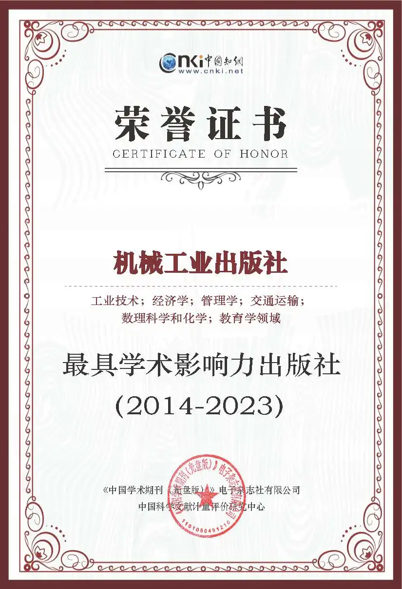 机械工业出版社在第十四届中国国际数字出版博览会上被评为“最具学术影响力出版社(2014-2023)”,涵盖工业技术、经济学、管理学、交通运输、数理科学及化学、教育学六大领域。尤其在工业技术、经济学和管理学三个领域位列前三甲。该榜单由中国知网和《中国学术期刊(光盘版)》电子杂志社联合发布,基于文献计量学评估了过去十年图书出版的学术影响力,覆盖了589家出版单位,参考“中国图书馆分类法(第五版)”,对17个学科领域进行了排名。评选标准是各领域排名前5%且被引图书数量不少于20种。