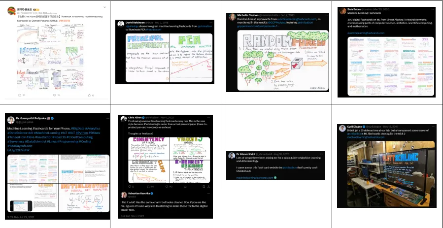 每年都有大咖推荐,北京邮电大学陈光教授@爱可可-爱生活、《Text Mining with R》合著者之一David Robinson、Google工程师Michelle Casbo、AWS架构师Bala Subra、《Build a Large Language Model》作者Sebastian Raschka、剑桥大学AI/ML博士后Ahmed Zaidi等业内专家无不在为这套机器学习闪记卡打call。
