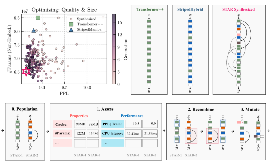 STAR 算法的核心是将模型架构表示为称为“STAR 基因组”的分层数值序列,并使用进化算法对其进行优化。这个过程是迭代的:将基因组编译成具体的架构,对其进行评估,然后选择并重组性能最佳的架构以创建下一代。