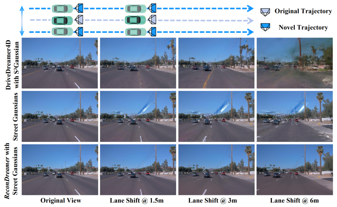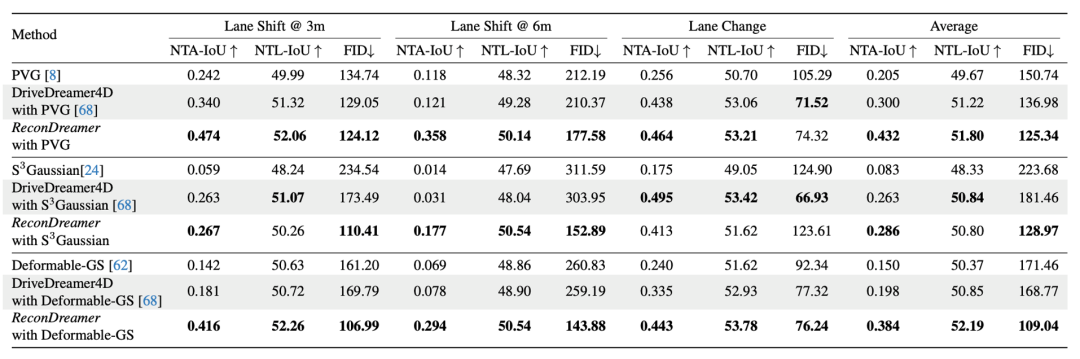 不仅如此,与最近的 DriveDreamer4D 相比,ReconDreamer 所提出的渐进式修复方案可以在大范围相机运镜下显著提升渲染性能,其对比结果如下所示。