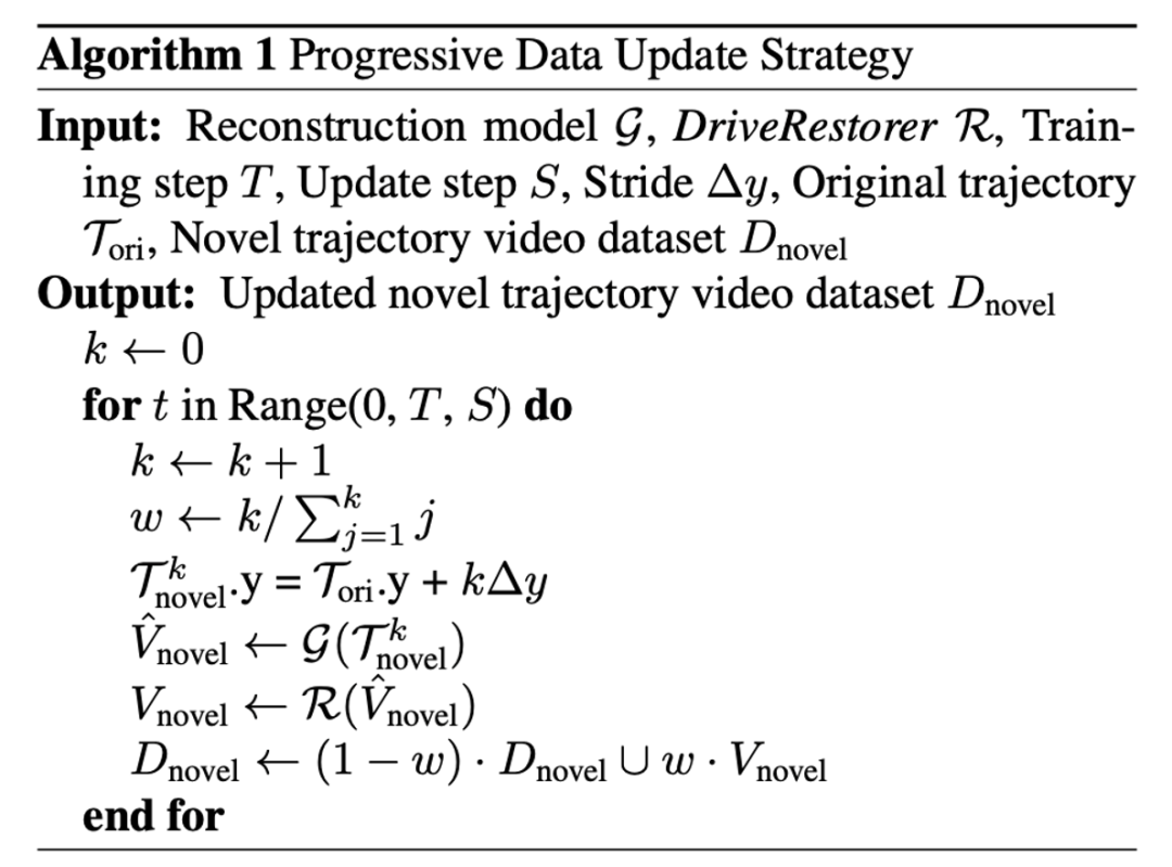 此外,ReconDreamer 还提出了一种渐进式修复策略,其算法流程图如下所示,通过逐渐扩大渲染视角范围来逐步更新训练数据,以提升大范围相机运动时的渲染质量。