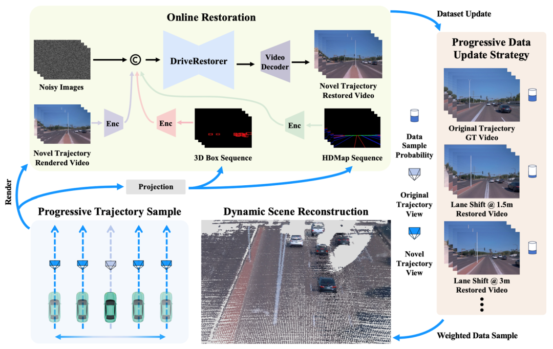 ReconDreamer 的整体框架如下图所示,首先用传统方法如 Street Gaussians 进行场景重建,然后采样新轨迹并进行渲染,为了消除渲染视频中的伪影和缺陷,创新性地利用视频生成世界模型 DriveRestorer 进行视频修复,然后将这些恢复的视频与原始视频一起用于优化重建模型。ReconDreamer 还提出了渐进式数据更新策略,从小位移渲染开始修复,逐步扩展到大范围渲染的修复,这个迭代过程会持续进行直到重建模型收敛为止。