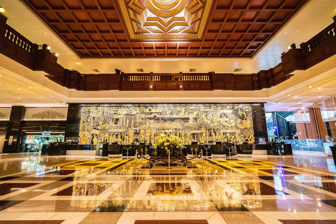 华南首家“中国白金五星级饭店”,也是首批豪华五星级酒店标志之一。大堂中央的《红楼梦》主题镶金壁画尤为吸睛。