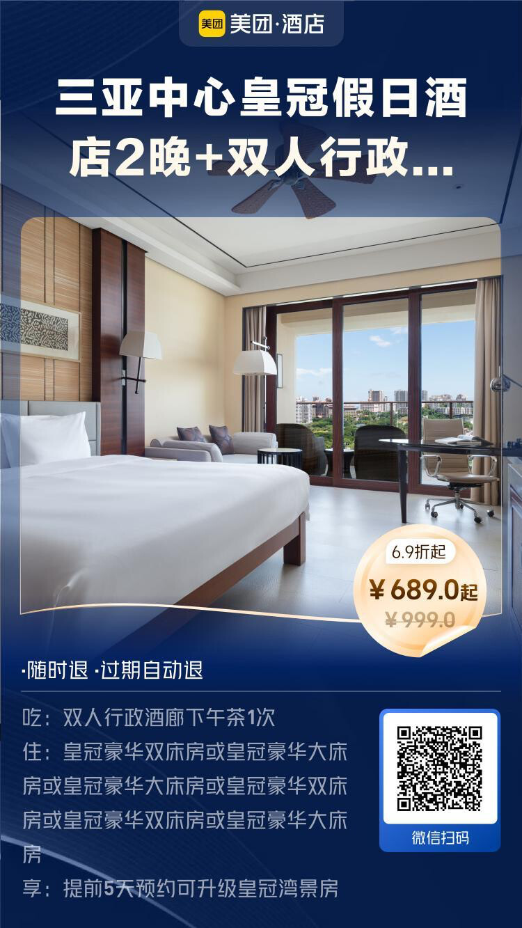 皇冠豪华房2晚+双人行政酒廊下午茶1次+提前5天预约可升级皇冠湾景房,689元。有效期到2025年6月25日,热门日期有加价。