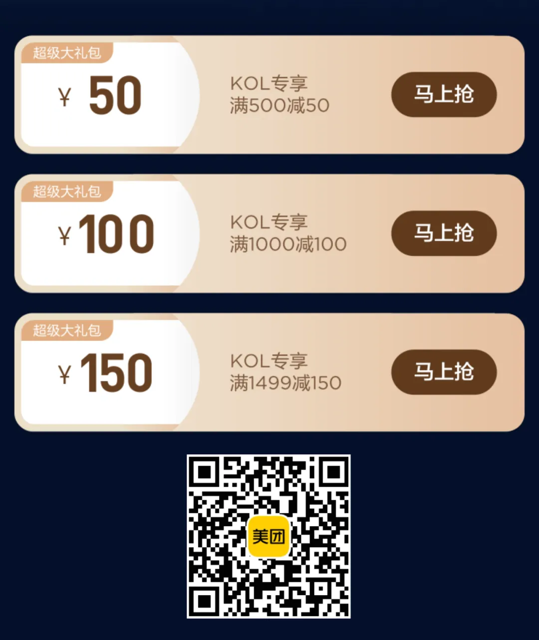 先扫码领取我的专属优惠券,满500-50、满1000-100和满1499-150,部分套餐凑单后下单,价格更划算。