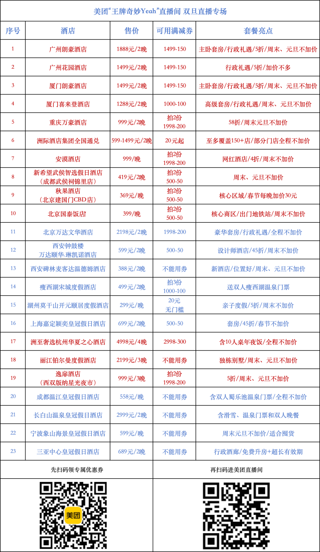 **预订方式:** 大部分套餐可以通过美团酒店王牌直播间预订,部分套餐需要通过扫描二维码购买。预订前记得领取优惠券,部分套餐凑单购买更划算。