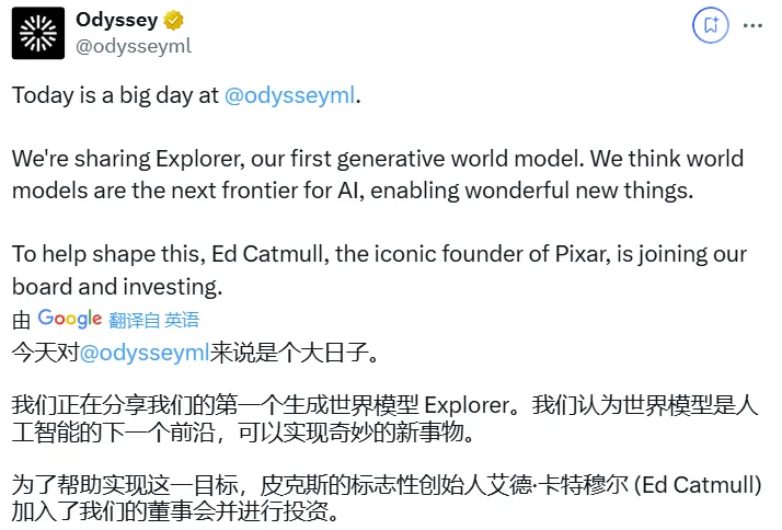 从 Odyssey 的博客介绍来看,Explorer 是为 Odyssey 的目标或者说细分领域服务的:「我们(与皮克斯)有一个共同信念,那就是技术必须服务于故事和故事讲述者。在这个 AI 时代,尤其如此。」简而言之:故事为王(Story is king)。他们希望为「电影、游戏和其他领域带来下一个重大技术突破:生成式世界模型。」