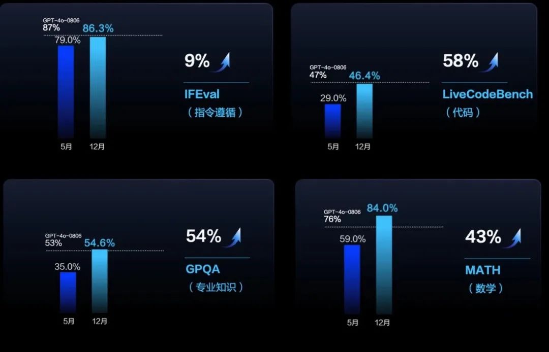 此外,豆包通用模型 Pro 在指令遵循、代码、专业知识、数学层面全面对齐了 GPT-4o 水平。其中指令遵循能力提升 9%,代码能力提升 58%,GPQA 专业知识方面能力提升 54%,数学能力提升 43%,推理能力提升 13%。