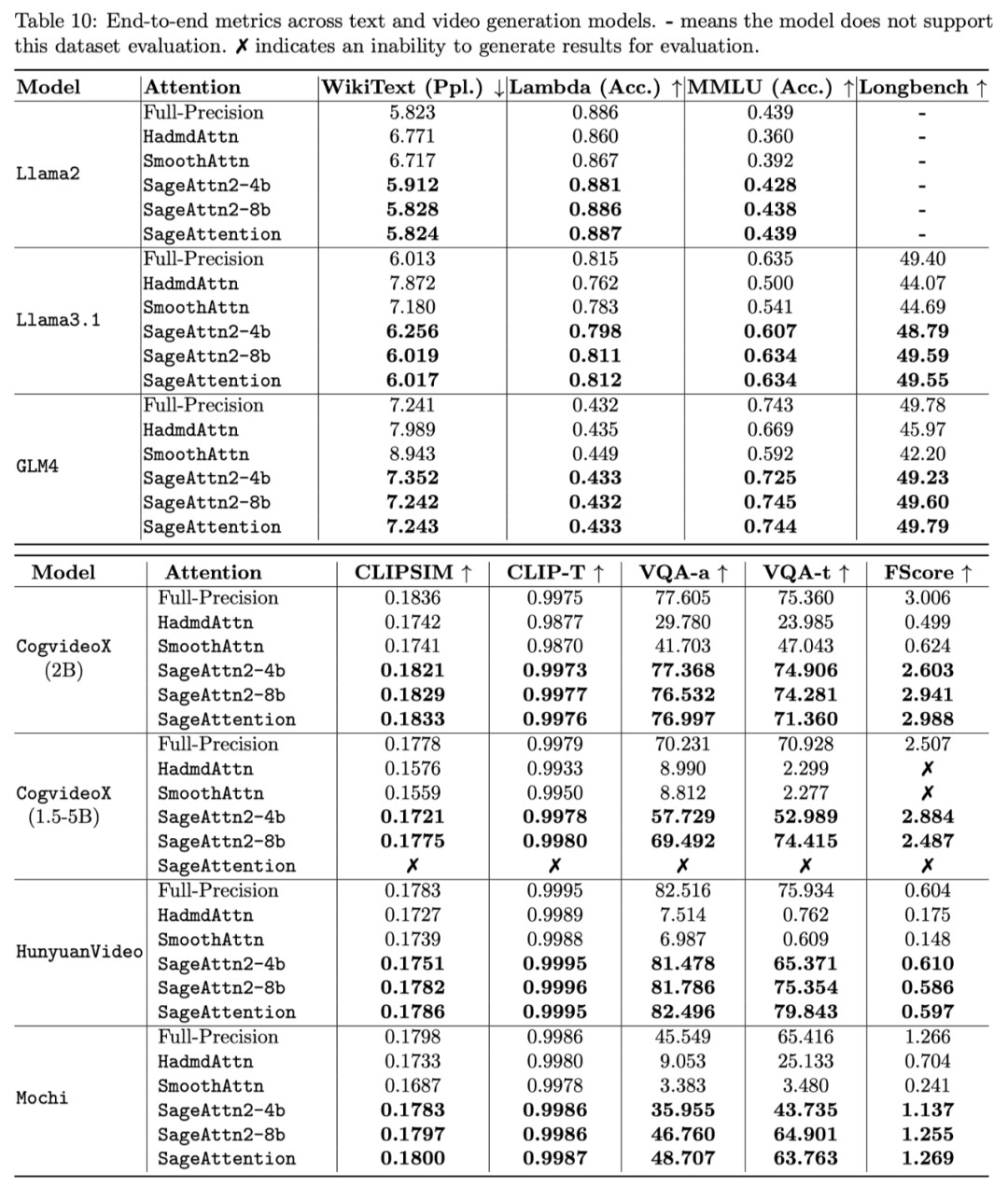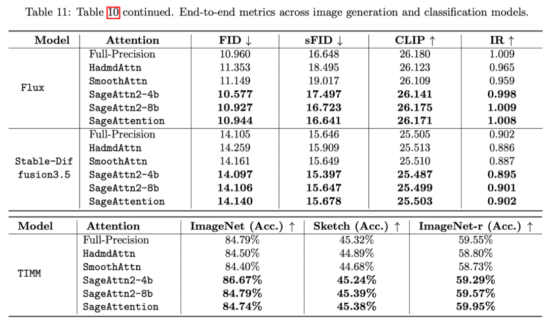 下表展示了各个语言、视频、图像生成模型中 SageAttention2 的端到端精度表现: