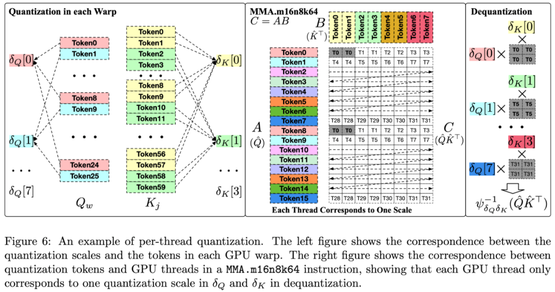具体来说,在 SageAttention 中,每个 Q 的块将被划分为 c_w 个段,由 GPU 流处理器(SM)中的 c_w 个 GPU warp 处理。然后,每个包含 32 个线程的 warp 会使用 NVIDIA 的 mma.m16n8k64 PTX 指令来执行 QK^⊤运算。根据这一指令的布局要求,研究团队发现一个 warp 内的 Q [8×(n%8)] 可以共用一个量化缩放参数,而一个 warp 内的 K [8×(n%8)] 和 K [8×(n%8+1)] 也可以共用一个量化缩放参数,其中 n 是 token 索引。