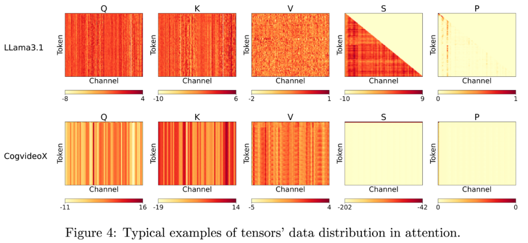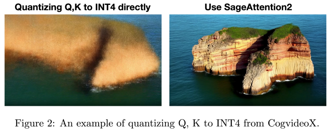 研究团队发现直接将注意力运算中的 Q, K 量化为 INT4 后将会导致在几乎所有模型和任务上都会得到极差的结果,例如,在 CogVideoX 文生视频模型中,会得到完全模糊的视频;Llama2-7B 进行四选一选择题任务上得到 25% 的准确率。