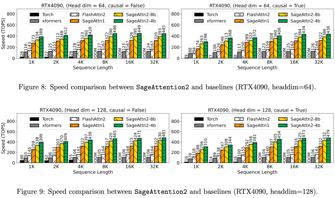 尽管 SageAttention 提出将 Q,K 量化至 INT8,将 P,V 保持 FP16 精度且采用 FP16 的矩阵乘法累加器来加快 Attention 的速度。然而,这样做的缺点是:1)INT8 的矩阵乘法只达到了一半的 INT4 矩阵乘法的速度,2)使用 FP16 的乘法累加器的 FP16 的矩阵乘法的加速只在 RTX4090 和 RTX3090 显卡上有效。