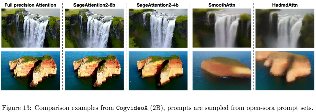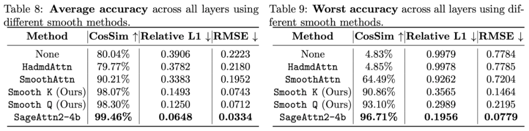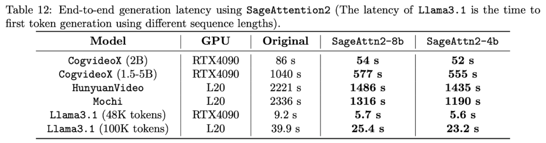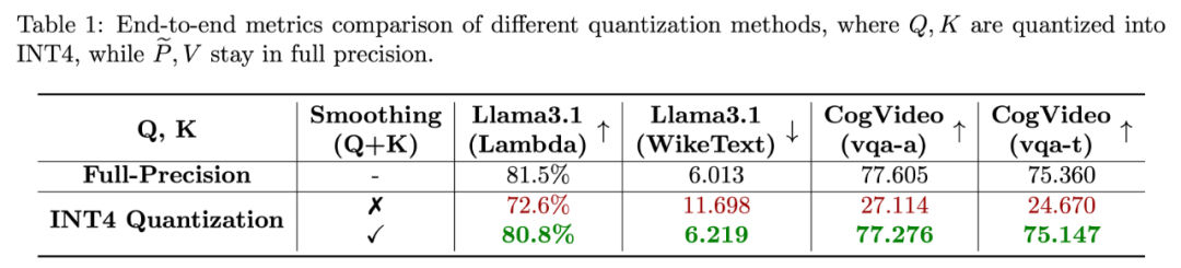 这使得相比直接量化 Q, K 至 INT4 的准确度有质的改变,如下表展示了对比了该方法和直接量化 Q, K 至 INT4 在 Cogvideo 和 Llama3.1 上的端到端表现。