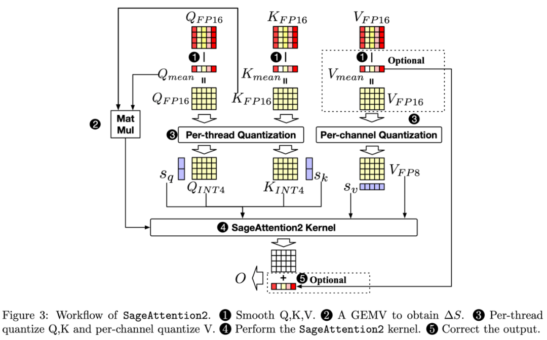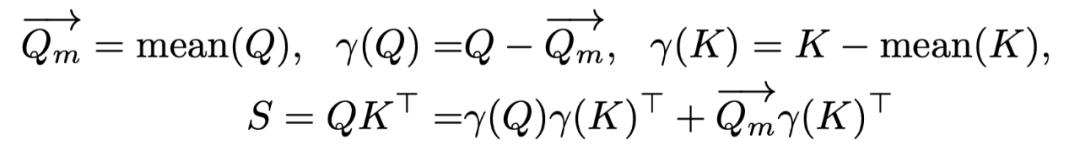 (1)保留 SageAttention 中对 K 进行平滑处理的同时,提出对 Q 进行平滑处理:Q – mean (Q)。其中 mean (Q) 是沿着通道维度的平均值向量。完成该平滑操作后需要在 Attention 计算过程中将 mean (Q) 和 K^T 的向量与矩阵乘法的结果补偿到 S 中。