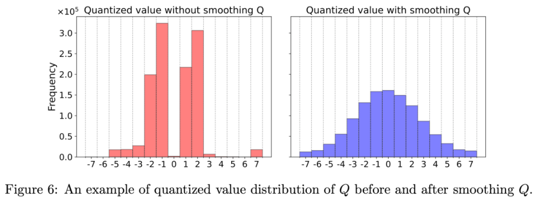 矩阵 Q 平滑前后的数据分布可视化的结果如下,可以发现平滑后的 Q 对 INT4 数据范围的利用度更高: